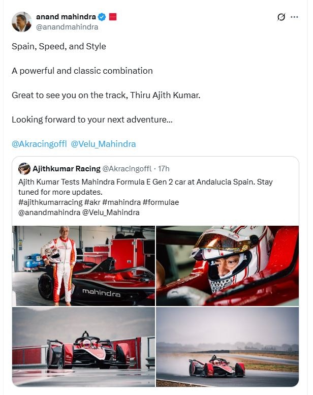 Anand Mahindra, chairman of the Mahindra Group, took to social media to express his admiration for Ajith, praising his stint in Andalucia.