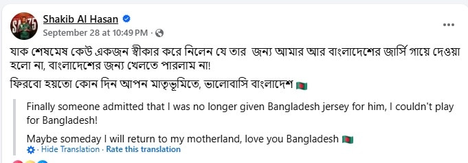 "So someone has finally accepted that it's because of him that I can never put on the Bangladesh jersey again, because of whom I can't play for Bangladesh again. Maybe I will return to my motherland one day. Love you, Bangladesh," Shakib wrote on Facebook.